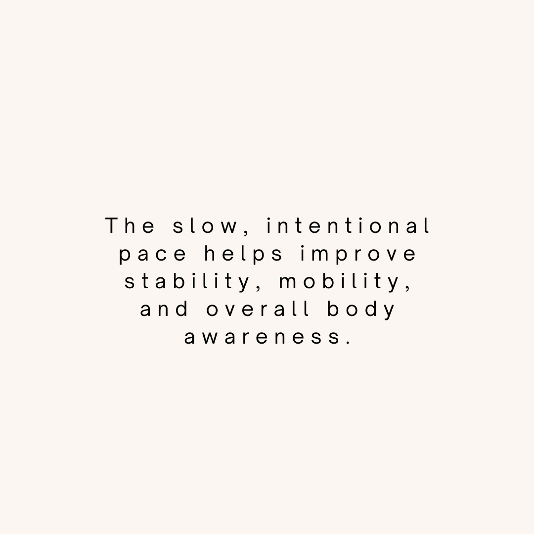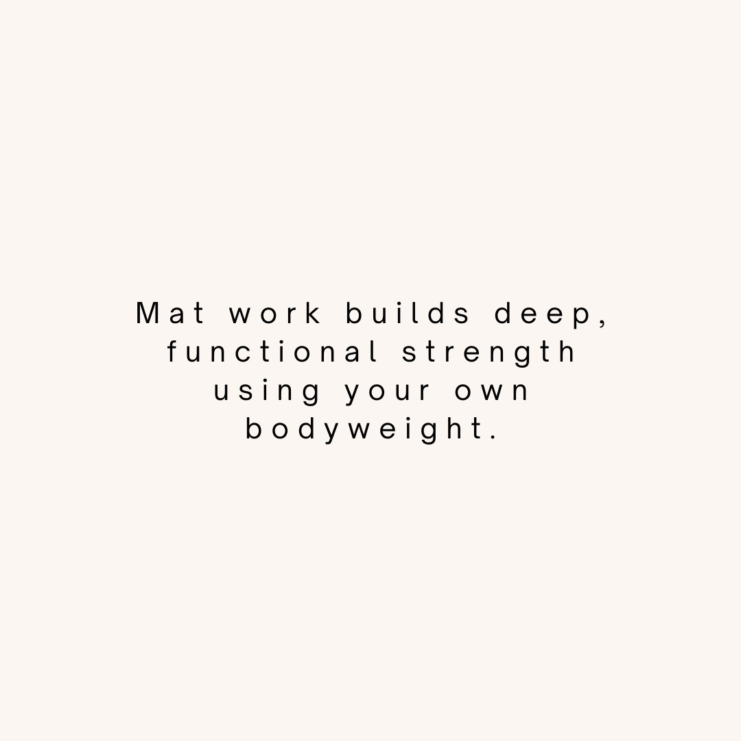Mat Pilates uses controlled, bodyweight exercises to strengthen your core, support your spine, and improve posture. The steady, intentional pacing helps build stability and mobility while reducing tension. It’s an effective, low-impact way to feel stronger, more balanced, and better in your body.