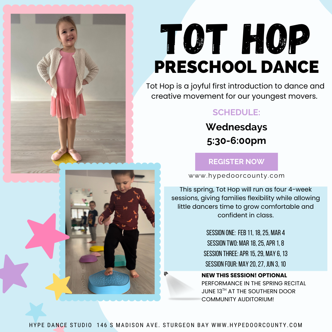 Tot Hop participants also have an optional opportunity to perform in our spring recital on Saturday, June 13 at Southern Door Community Auditorium.